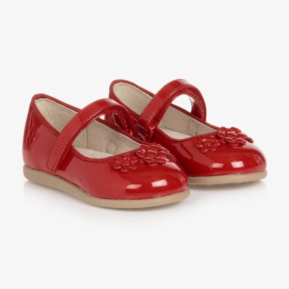 Lovely red patent pumps for little girls by Mayoral, with pretty 3D flowers on the toes. Made in smooth faux leather, they have a soft canvas lining and non-slip rubber soles. Fastening easily with a velcro strap, they have softly padded leather insoles for comfort and support.