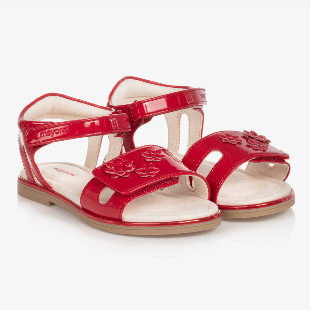 Pretty red sandals for girls by Mayoral, made in faux patent leather, with a soft leather insole and non-slip rubber soles. The uppers and padded ankle straps have adjustable velcro fastenings, with three tonal flowers on the toe strap. The brand's name on the ankle lends a signature touch.
