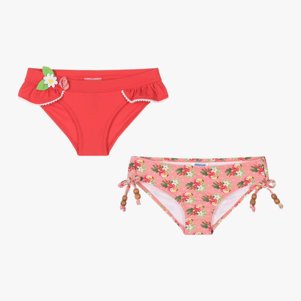 Two pairs of red and coral pink bikini bottoms for girls from Mayoral, made in silky, stretchy material. The red pair have pretty ruffles on the sides with white pom-pom edging and a sweet flower appliqué. The coral pink pair have an adorable red toucan print, lovely side ties and wooden bead trims.