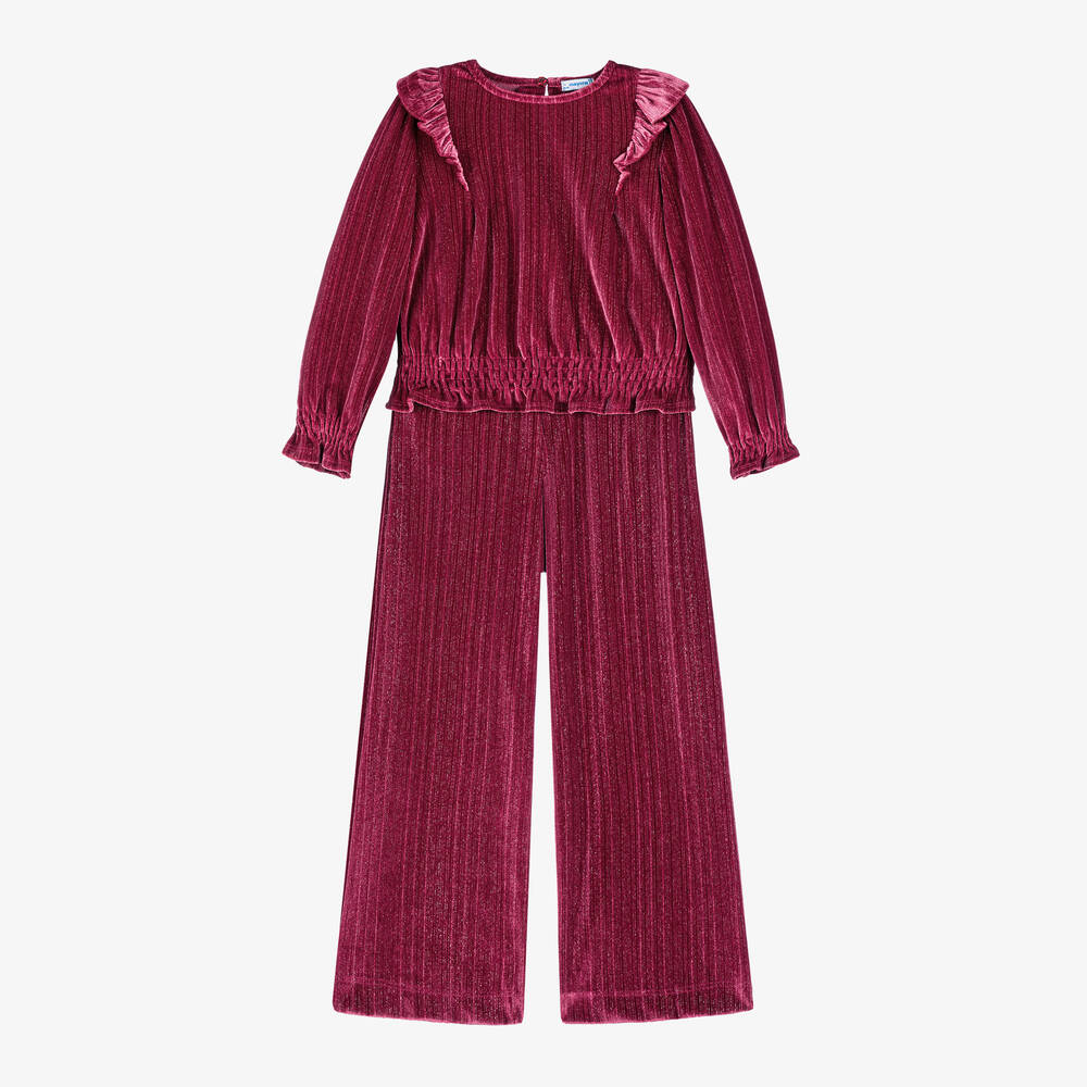 Burgundy red trouser set for girls by Mayoral. In velour with fabulous glitter accents, this lovely co-ord would make a great outfit for a party. With frills over the shoulders, the top has elasticated shirring on the cuffs and hem for shape. It fastens with a keyhole button on the back. The wide-leg trousers have an elasticated waist for comfort.