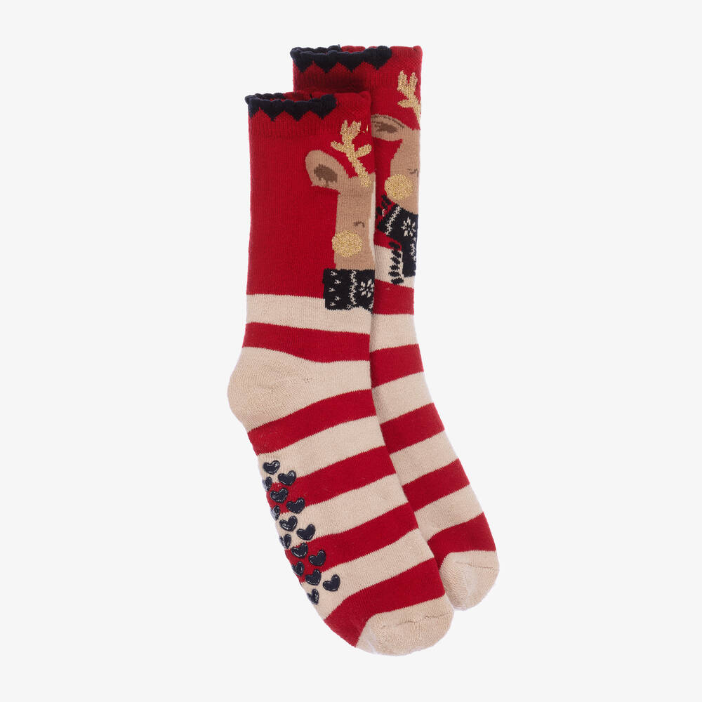 Girls Red Stripe Cotton Reindeer Socks