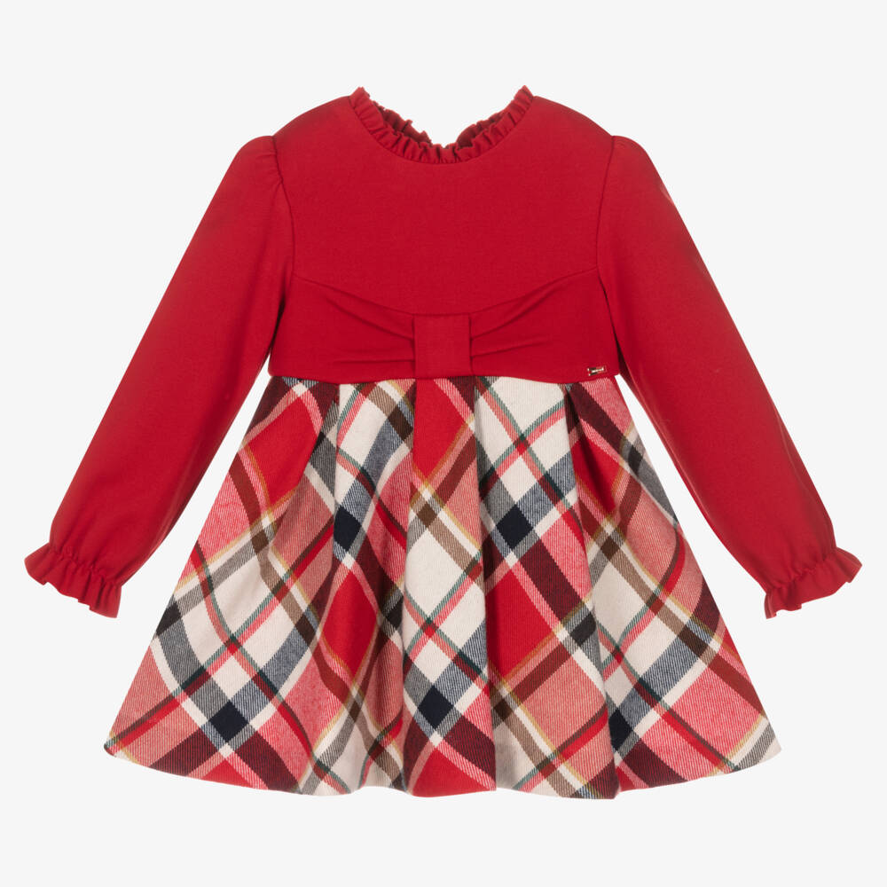 A red dress for little girls by Mayoral, with a jersey bodice and a softly woven skirt. This lovely dress has a frilly collar, ruched bow detailing, and a gold charm logo. The skirt is patterned in a tartan check, with an easy zip fastening on the back. The cotton voile lining is soft against the skin for comfortable wear.