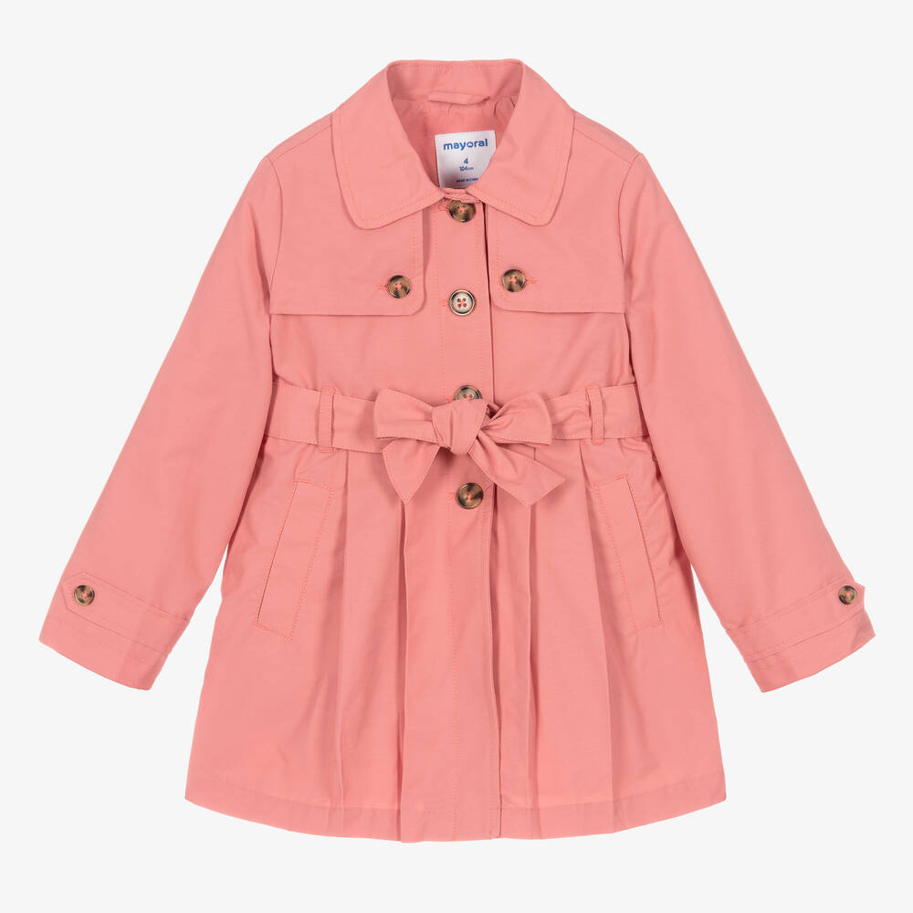 Girls classic rose pink trench coat by Mayoral. Smooth and silky, this smart design has single-breasted front button fastening and a fixed belt that ties in a bow at the front. There are useful pockets at the sides and it is fully lined in silky fabric for comfort.
