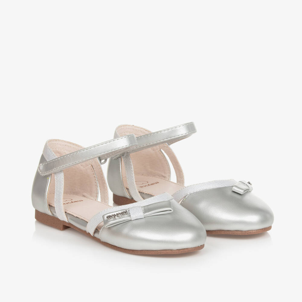 A lovely pair of silver open-sided shoes for girls by Mayoral, made from smooth faux leather. Decorated with a pretty branded bow on the toes with a sparkly trim, they fasten with a practical velcro strap around the ankle. Lined in soft leather with a lightly padded insole they have a slim rubber outsole for an elegant finish.