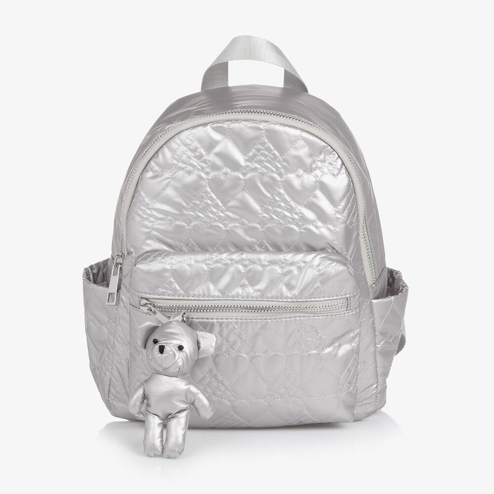 A metallic silver backpack for girls by Mayoral, ideal for carrying smaller essentials. It is made in soft faux leather, with a fun heart-shape quilted pattern. There is a zip fastening main compartment and two side pouches. The smaller zipped pocket on the front is finished with a 3D bear. The padded shoulder straps are adjustable for an ideal fit, and there is a useful carry handle on the top.