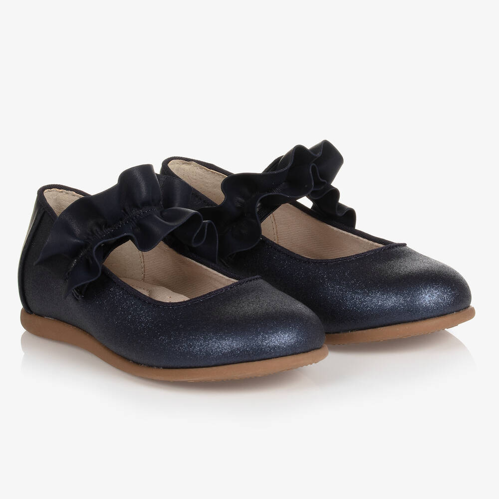 Slip-on navy blue pump shoes for little girls from Mayoral. The uppers are shimmering faux leather with an elasticated tonal ruffle strap across the foot for a secure fit. Lightly padded for added comfort the inner sole is durable leather and they are lined with cotton. The outer soles are non-slip rubber and textured to improve grip on slippery surfaces. These shoes are lined with 29% recycled cotton.