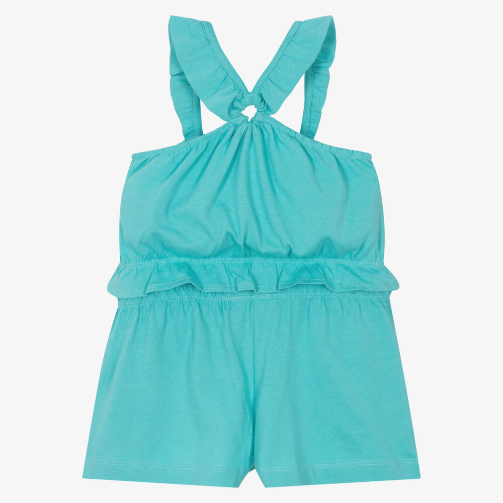 This turquoise blue shorts set for girls is by Mayoral. Made in soft, comfortable cotton jersey, the top has ruffled shoulder straps and a frilled, elasticated hemline. Easy to wear, both the top and shorts simply pull up.
