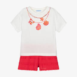 Fun cotton shorts set for girls by Mayoral, ideal for casual, sunny days. The white T-shirt is made in soft comfortable jersey, with a beach scene print embellished with fringing. The textured orange shorts are striped with pretty lace and lined in jersey for comfort. Easy to wear, the outfit simply pulls on.