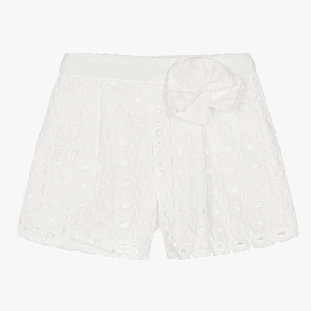 White shorts for girls by Spanish brand Mayoral, made in soft cotton broderie anglaise. Great for casual days, they have a fixed bow on the waist and a full lining for added comfort. They are elasticated on the back of the waistband, making them easy to pull on.