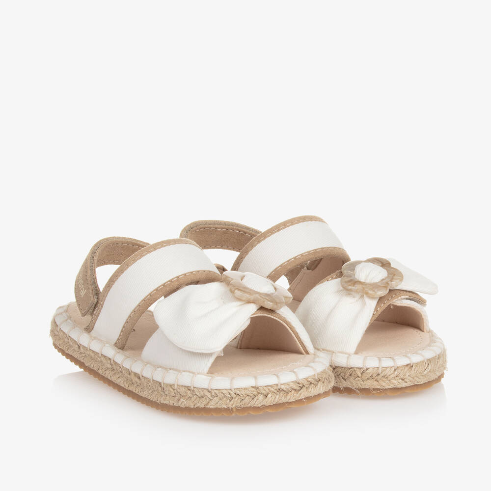 Pretty white canvas sandals for girls by Mayoral, made in a soft cotton blend. Styled with beige trims, they fasten with velcro straps across the foot and around the back of the heel. The front strap has a sweet bow and flower charm. The canvas insole is padded for a comfortable fit. They have Espadrille-style braided jute midsoles, with rubber non-slip soles for improved grip.