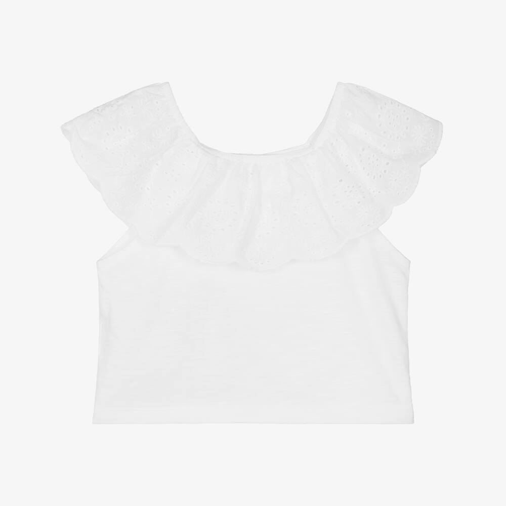 Sweet white summery top for girls by Mayoral, with a lovely, scalloped, broderie anglaise ruffle around the elasticated neckline. To be worn on or off the shoulders, it is made in soft, comfortable, slubbed jersey.