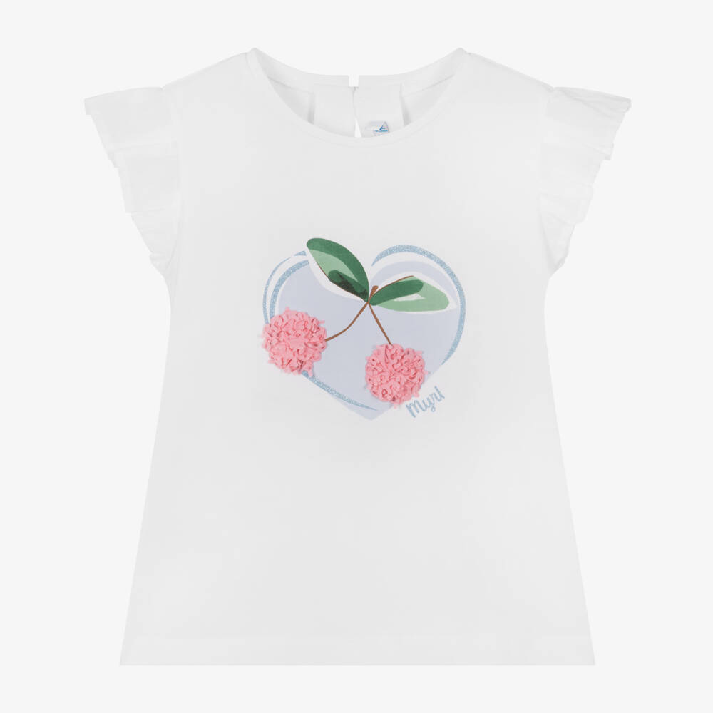 Girls white cotton T-shirt by Mayoral, featuring a glittery logo print and charming pink cherry appliqués. Styled with pleated voile sleeves, this casual tee is made in soft jersey with a keyhole button fastening on the back.