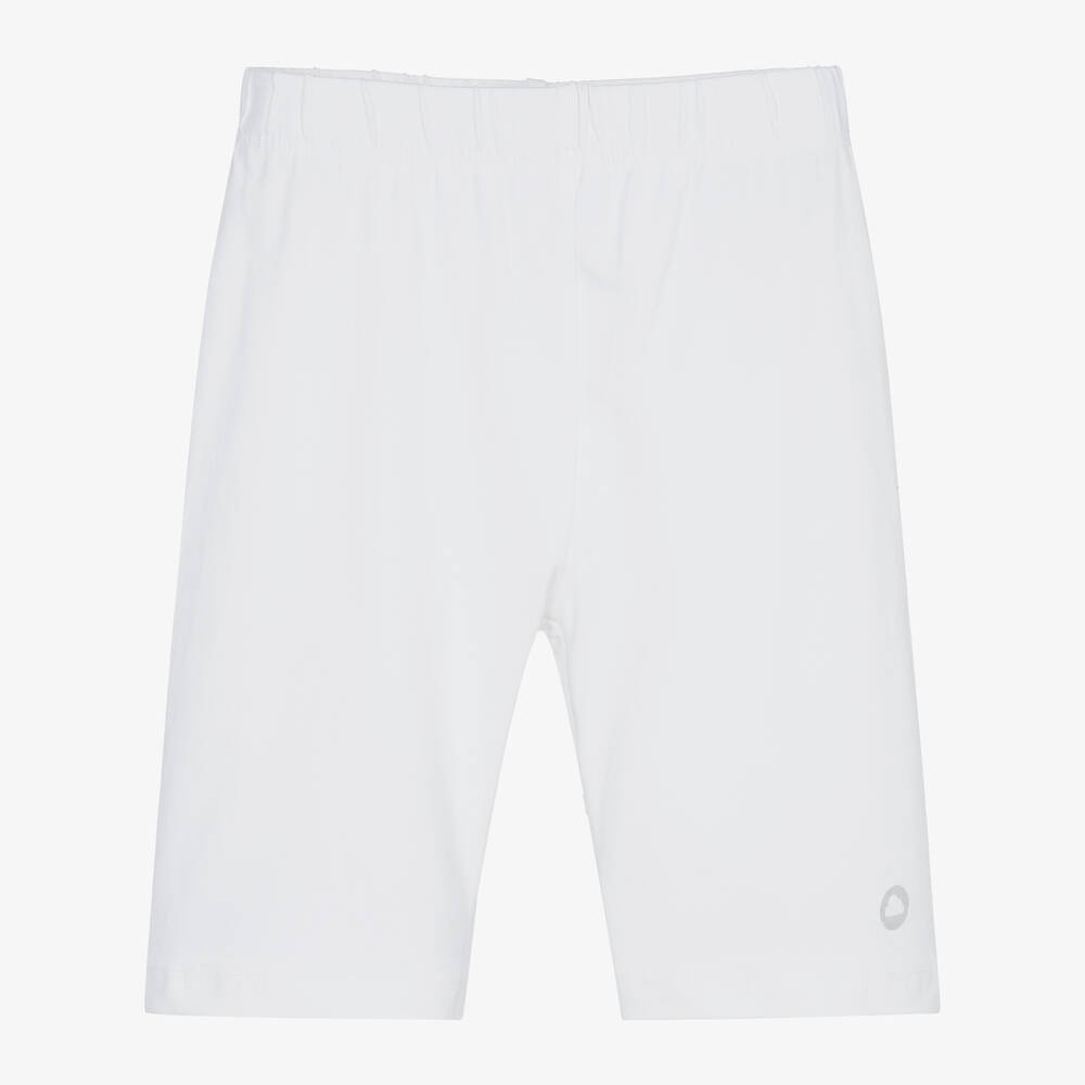 Casual off-white shorts for girls by Mayoral, made from soft and stretchy cotton jersey. In a sporty cycling style, these easy-to-wear shorts have an elasticated waistband for a comfortable fit. A branded metallic silver logo is printed on one leg.
