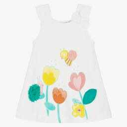 Little girls will look delightful in this white dress by Mayoral. Made in soft cotton jersey, this casual, sleeveless style features a colourful flower and cute insect design, with playful 3D and interactive elements. Comfortable and easy wearing, it has a gentle A-line shape, with a sweet bow on one shoulder.