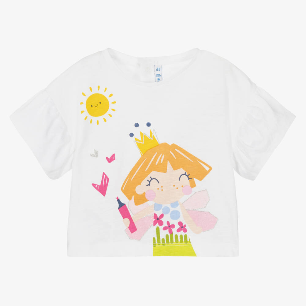 Casual white cropped T-shirt for little girls, by Mayoral. Made in soft cotton jersey, this relaxed tee has a cute and colourful girl graphic printed on the front with glittery trims. It fastens with useful poppers on the back, and has dropped sleeves for a laidback look.