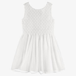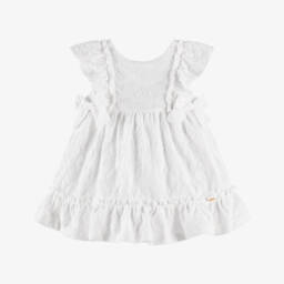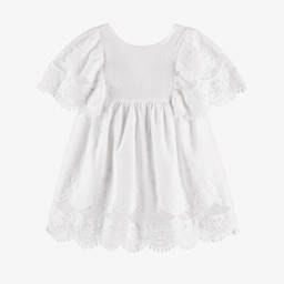 White dress for little girls by Spanish brand Mayoral, made in a beautiful, breathable linen and viscose blend. It has a ruffled collar and sleeves, a metal logo on the bodice, and beige crochet embroidery trims. There is a concealed zip fastening on the back to ensure simple dressing.