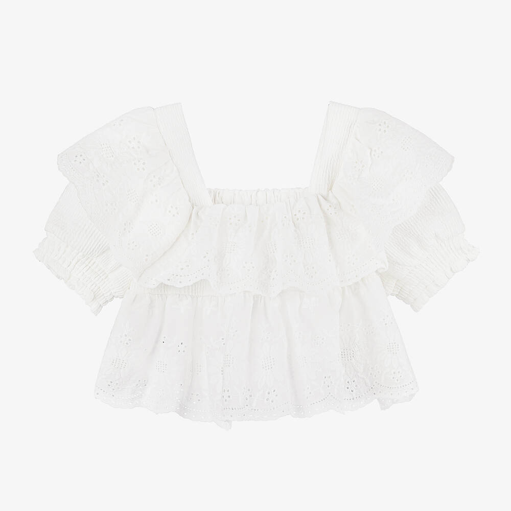 A pretty white short-sleeved blouse for girls by Mayoral, made from a soft and lightweight cotton blend. This top has a delicately embroidered floral pattern with ruffled trims and crinkled puff sleeves. It is styled with a square neckline and has a scalloped hem for a sweet finish.
