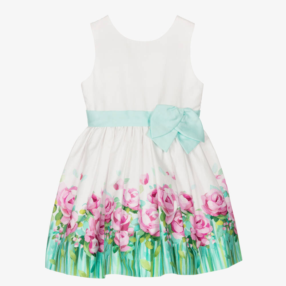 Girls white cotton poplin dress by Mayoral, with a lovely pink and green floral print around the hem. The skirt is gathered around the waist for a fuller shape and has a pale green fixed sash with a pretty bow detail on the front. It is fully lined for comfort and fastens with a concealed back zip for a neat finish.