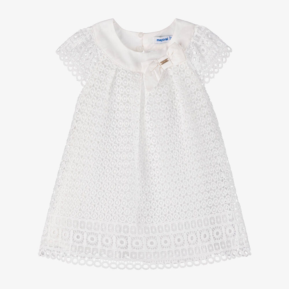 A beautiful white dress for little girls by Spanish brand Mayoral, made from guipure lace fabric. Designed in an A-line silhouette, it has little capped sleeves in a pretty pattern to match the hemline for a simply elegant special occasion look. The plain pink neckline is trimmed with a lovely bow and a subtle logo charm. It is fully lined in cotton voile for comfort and fastens with buttons on the back.