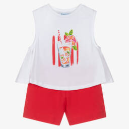 Summery shorts set for girls by Mayoral, made in soft, comfortable jersey. The sleeveless white top has a print of a drink with glittery, iridescent accents. It is styled with a pretty split back and flared panels on the sides. The coordinating red shorts have a frilled elasticated waist, ensuring comfort. Easy to wear, the set simply pulls on.