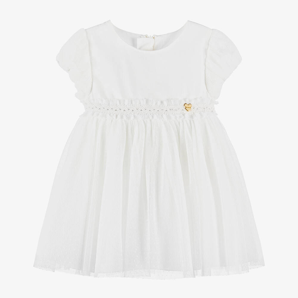 A lovely white dress for little girls by Mayoral, ideal for a special occasion. In a soft cotton blend, it has a round neckline and a woven ivory trim on the waistline. A gold logo charm can also be seen on the front. The short sleeves have elasticated cuffs and are layered with spotted tulle to match the full skirt. The dress is lined with two layers of soft cotton fabric and fastens on the back with a concealed zip.