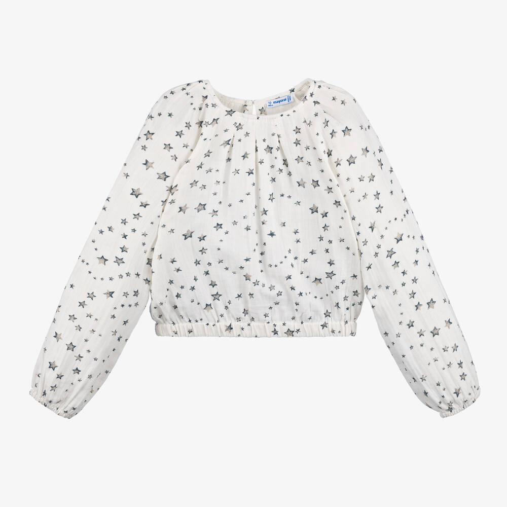 Beautifully soft and lightweight, this off-white Mayoral blouse for older girls is made in comfortable double-cloth muslin with a beige and navy blue star pattern. It is pleated from the neckline with an elasticated hemline to sit on the waist, creating a relaxed silhouette. The raglan, long sleeves are full and gathered at the elasticated cuffs to complement the style and there is a simple keyhole button fastening on the back.