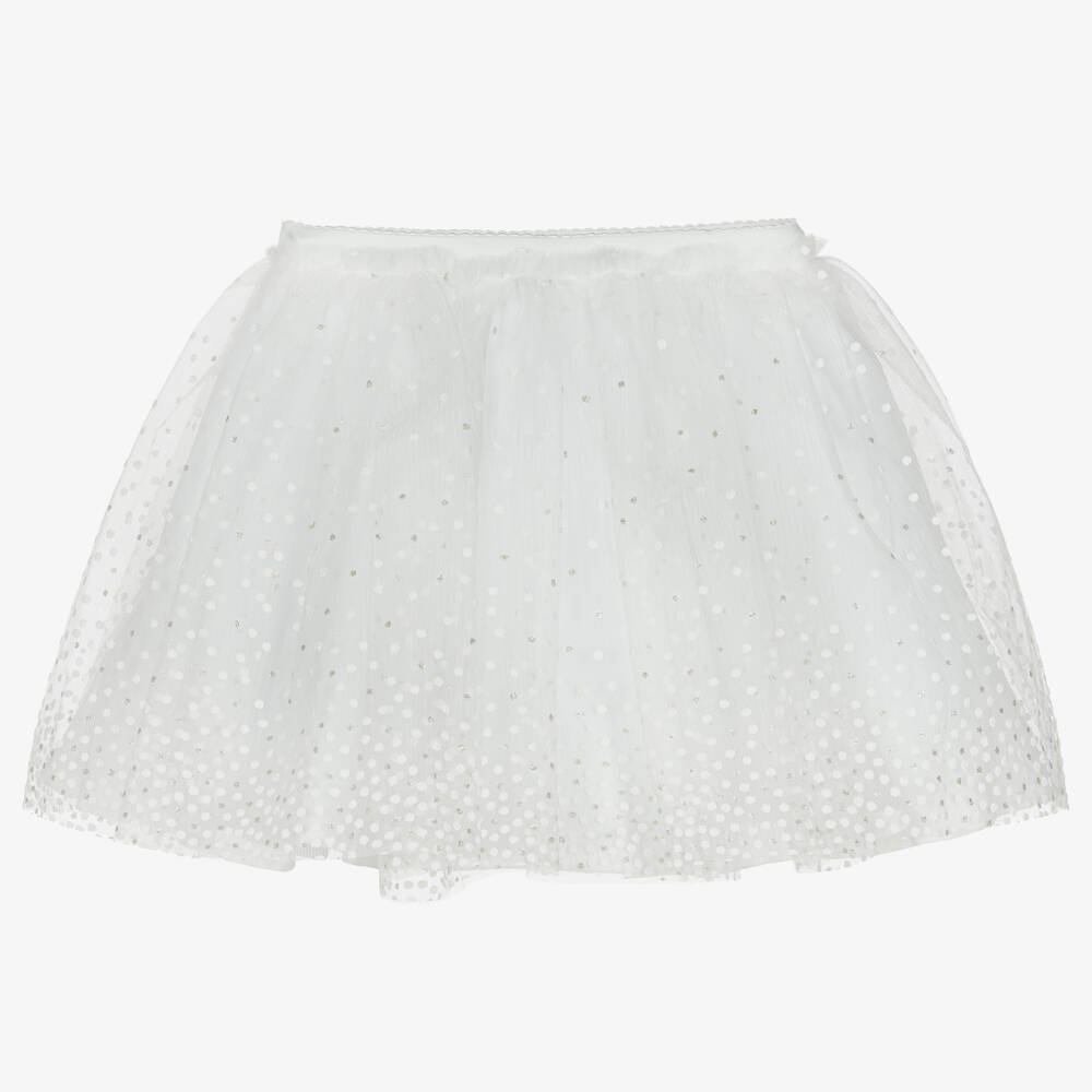 Lovely white tulle skirt for girls from Mayoral. Ruffled and gathered around the elasticated waistband, it has glittery silver and white polka scattered dot prints around the hemline. It is made in a double tulle layer with a lightweight cotton-blend lining for a beautifully flared shape.