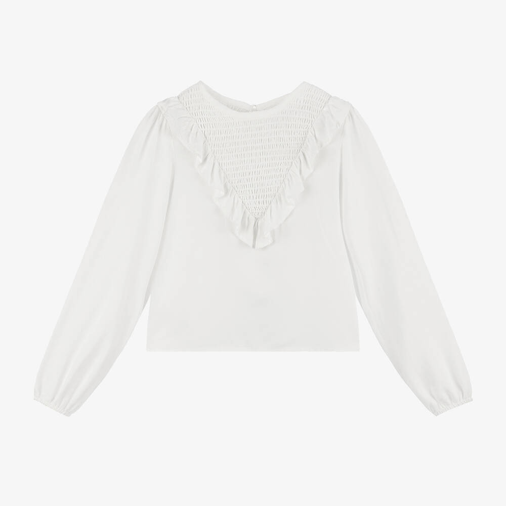 Pretty White blouse for older girls by Mayoral, made in soft viscose twill. There is a frill on the front and over the shoulders, with shirred panels front and back. The long sleeves have elasticated cuffs and there is a single keyhole button fastening on the back.