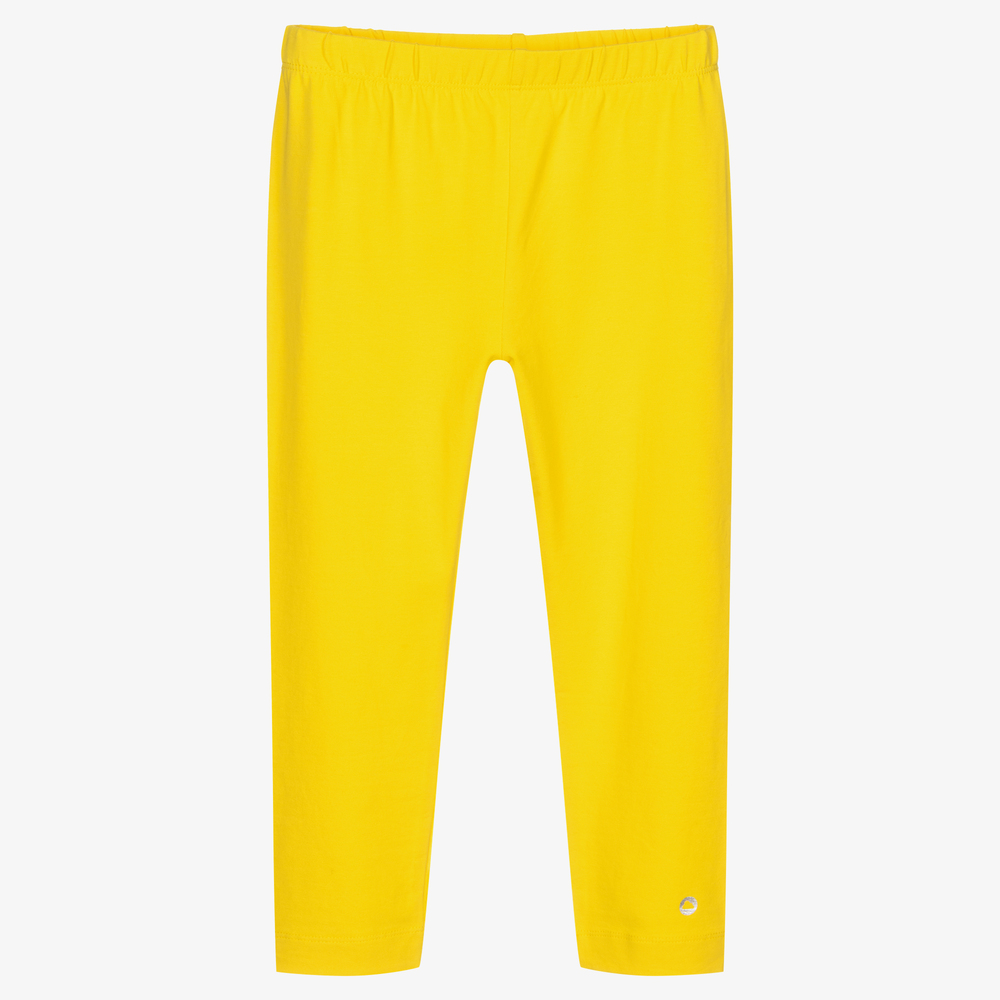 Cropped yellow leggings for girls by Mayoral. Made in comfortable sustainable cotton jersey, they have an elasticated waistband and a shiny silver cloud logo printed on one leg.