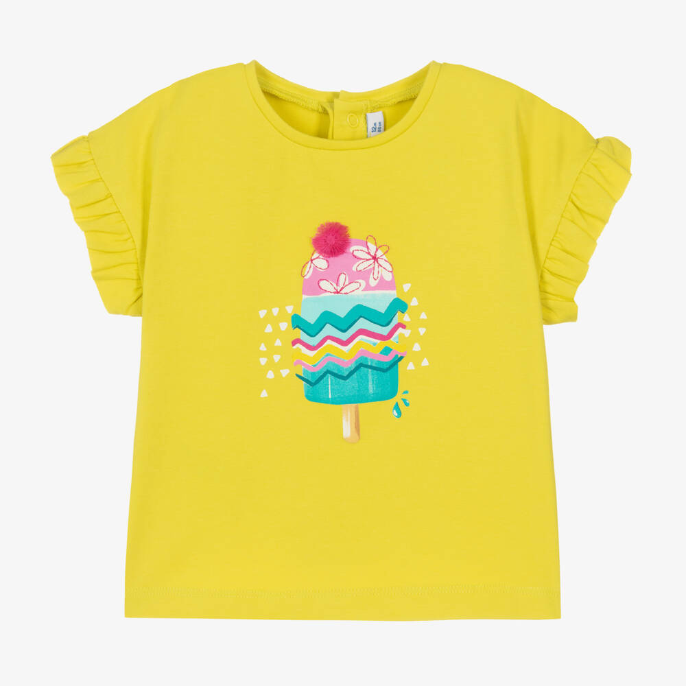 Lovely and bright, this acid yellow T-shirt for little girls is by Spanish brand Mayoral. Made in soft and stretchy cotton jersey with popper fastenings on the back, the little sleeves are detailed with pretty frill trims. The front has a colourful ice lolly motif with embroidered flowers and a pink pom-pom appliqué.