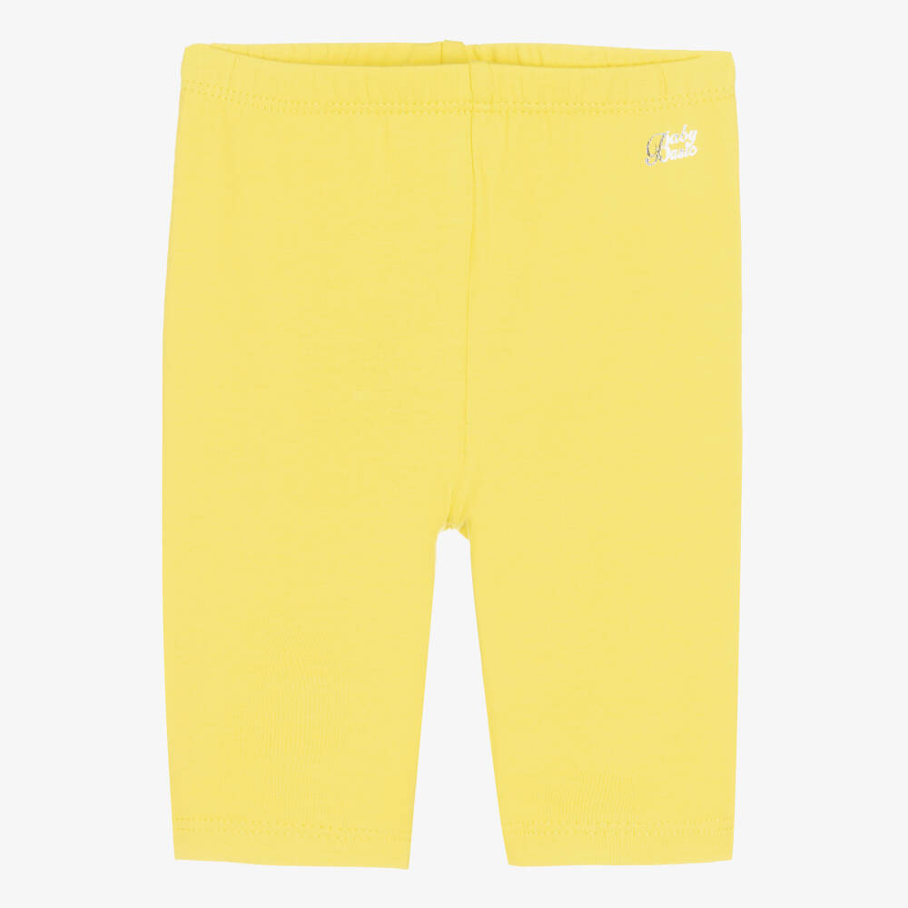 Little girls yellow leggings by Mayoral, made from soft and comfortable cotton jersey in a cropped length. They have a tiny silver logo print on the front by the elasticated waistband.