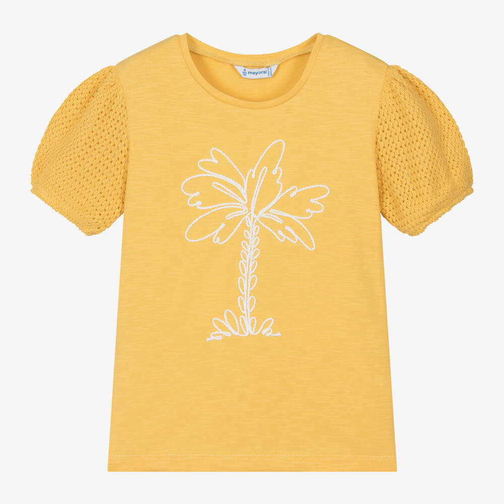 A casual yellow T-shirt for girls by Mayoral, made in soft and comfortable cotton jersey. There is a white embroidered palm tree motif on the front, and the gently puffed short sleeves are in a pretty crochet knit.