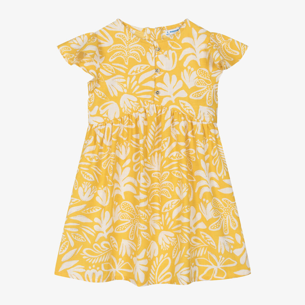 A lovely yellow dress for girls from Spanish brand Mayoral, patterned with white and gold florals. Made in a soft and lightweight weave, it has a gathered, shaped waistline and ruffled short sleeves. There are button fastenings on the front and a neat zip on the back to help with dressing.