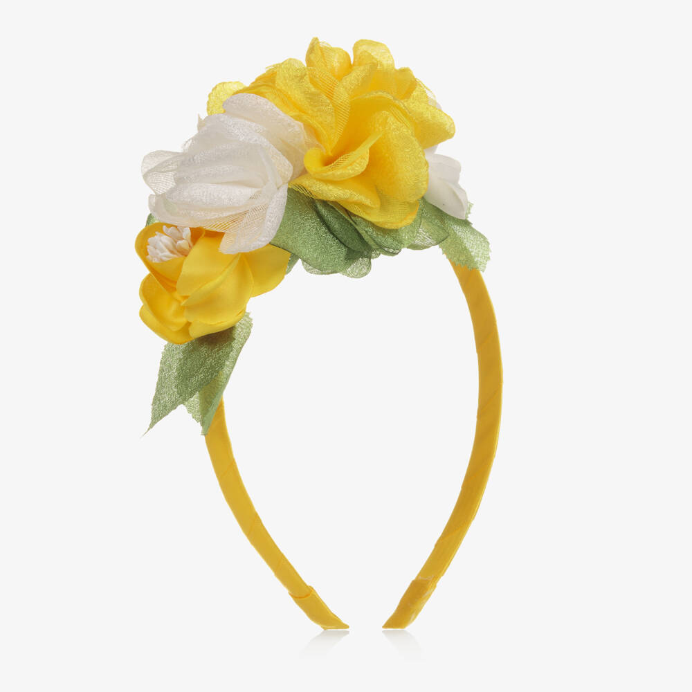Eye-catching yellow hairband for girls from Mayoral. The narrow flexible band is covered with silky grosgrain ribbon and has lovely 3D flowers on the top for a pretty finish.
