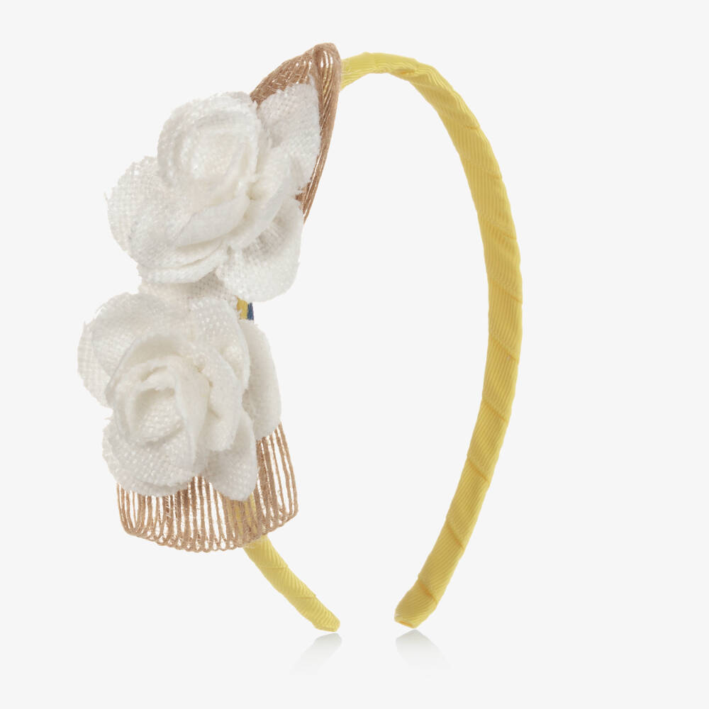 Pretty yellow hairband for little girls by Mayoral. The flexible band is covered with yellow grosgrain ribbon. There is a beige jute bow and white fabric flowers on the side.