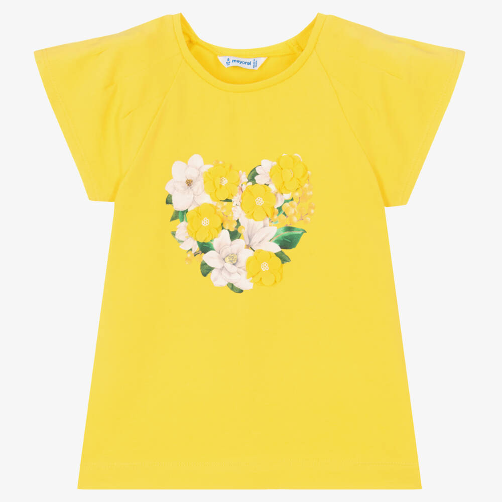 Bright yellow T-shirt for girls by Mayoral, made in soft cotton jersey. Designed with short, pleated raglan sleeves, there is a lovely floral print on the front in a love heart shape. The pretty chiffon flowers are finished with sequins in the centre for added texture and sparkle.