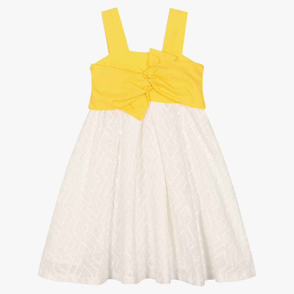Yellow and ivory cotton blend dress for girls by Mayoral. A stylish design, the silky smooth bodice has a tie detail across the front and wide shoulder straps. The flared skirt is made in a contrasting softly woven linen-feel fabric with an embroidered zigzag pattern. The dress is fully lined for comfort and fastens with a concealed zip on the back.