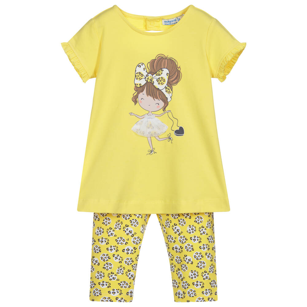 Sweet leggings set for younger girls by Mayoral. The yellow cotton jersey T-shirt has a girl printed on the front with a white tulle appliqué on her skirt. It has frilled cuffs and a useful popper fastening on the back, which has an open panel. The yellow leggings are patterned with white spots and a yellow leopard print.