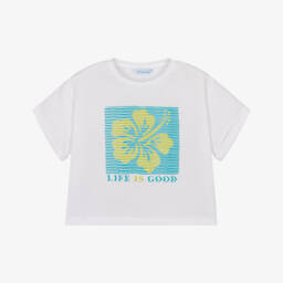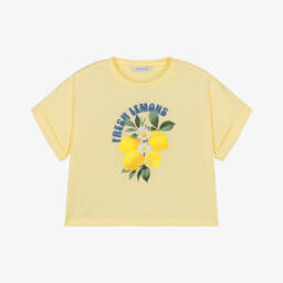 Pastel yellow T-shirt for older girls by Mayoral, featuring a vibrant lemon and slogan print on the front. Made in soft cotton jersey, it has a relaxed boxy fit and short sleeves with fixed turn-ups.