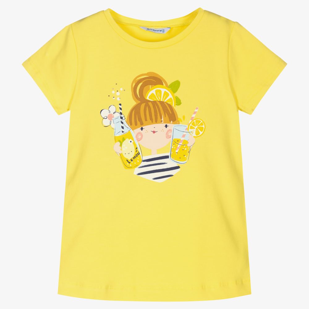 Bright yellow T-shirt for girls, by Mayoral. Made in soft cotton jersey, it has a cute girl drinking lemonade printed on the chest, with diamanté trims on the older sizes.