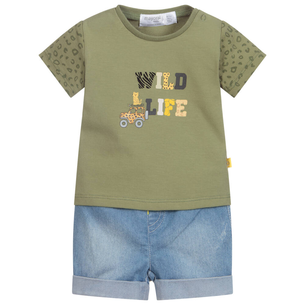 Cute shorts set for baby boys and girls by Mayoral Newborn. The stretchy, lightweight blue denim shorts have a washed and worn look, with the brand's logo printed on the back pocket. The green cotton jersey T-shirt has a safari jeep and leopard print on the front in yellow, with leopard print sleeves.