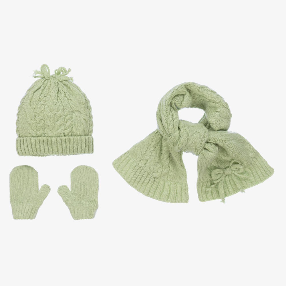 Green hat, scarf and mittens set for baby girls by Mayoral, knitted in a soft acrylic blend. The hat and scarf have a diamond and cable pattern and ribbed trims. The hat has a pretty knitted bow on the top and it comes with matching pink mittens.