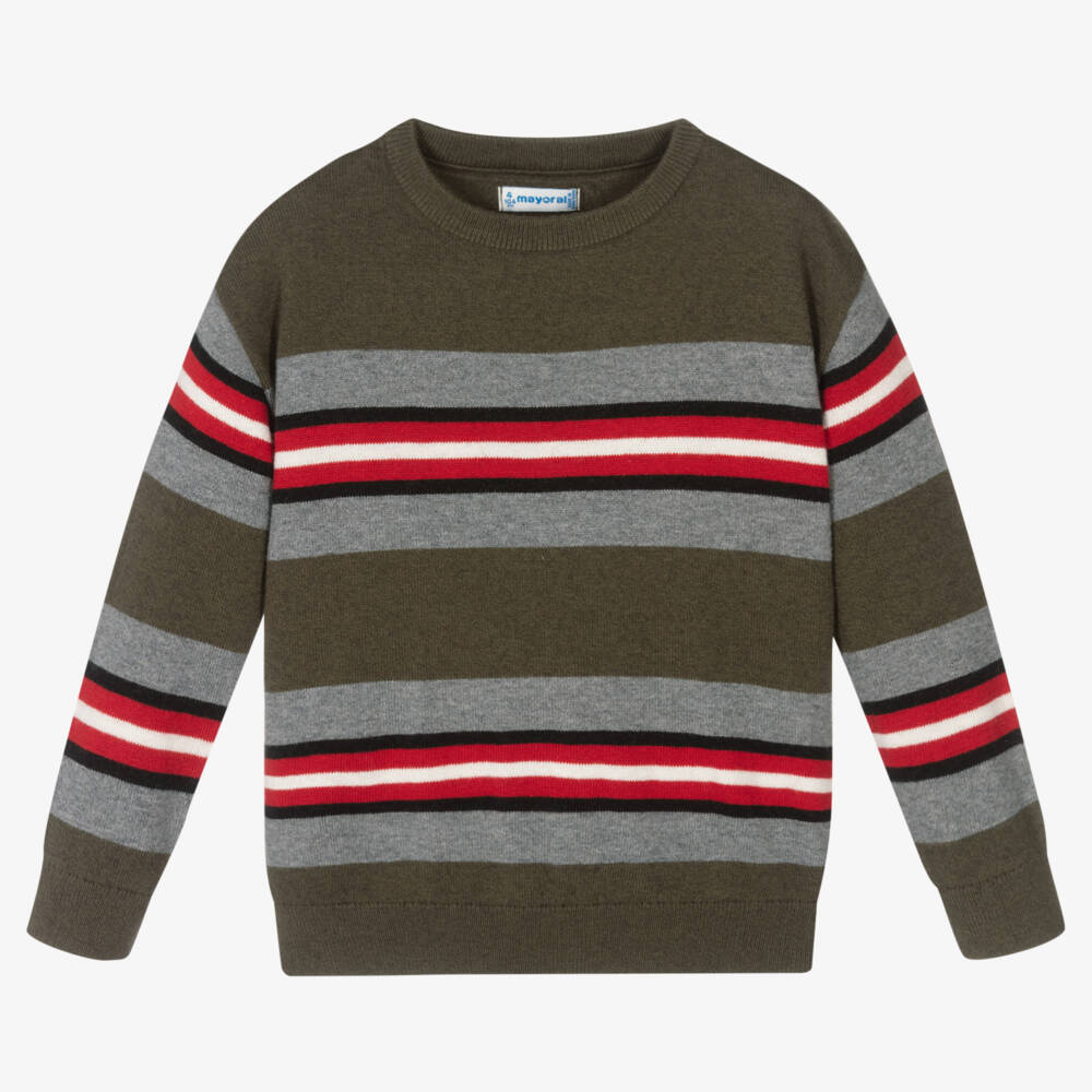 Soft green jumper for boys by Mayoral, patterned with grey, red and black stripes. It is knitted in a lightweight cotton and wool blend with ribbed cuffs, so will be both warm and comfortable on cooler days.