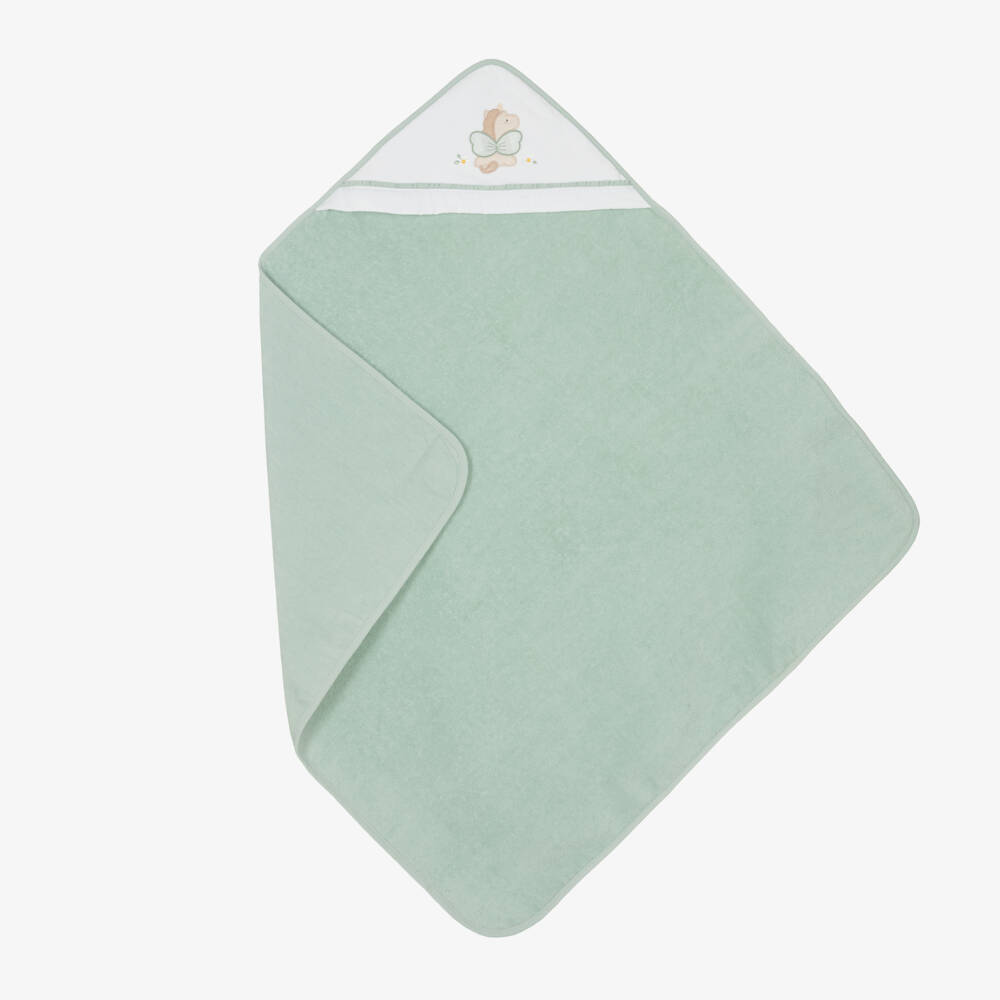 Ivory and sage green hooded towel for baby girls by Mayoral, made in soft and absorbent, sustainable cotton towelling. It is designed with an ivory hood with green ruffle trims and an interactive unicorn motif embroidered on the front. Soft against baby's delicate skin, it will keep your little one warm and snug after bathing and swimming.