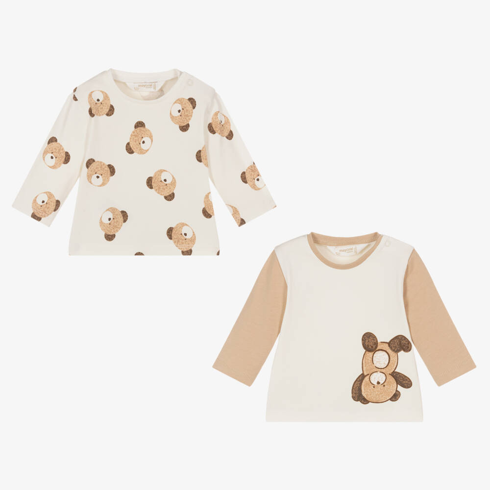 A pack of two ivory and beige long-sleeved tops for baby boys and girls from Mayoral. Made in soft cotton jersey, one has an all-over teddy bear face print, while the other has contrast beige sleeves and a single bear print on the front. To help with dressing, both have easy popper fastenings on one shoulder.