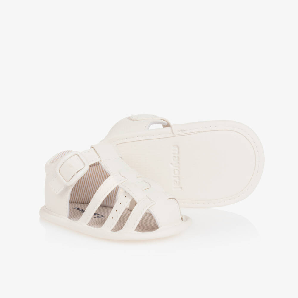 Sweet ivory pre-walker sandals for baby boys and girls by Mayoral, in smooth and flexible faux leather. These lightweight shoes are lovely for warmer weather, styled in a cage design with a soft striped cotton lining. They have velcro straps with faux buckles for easier dressing.