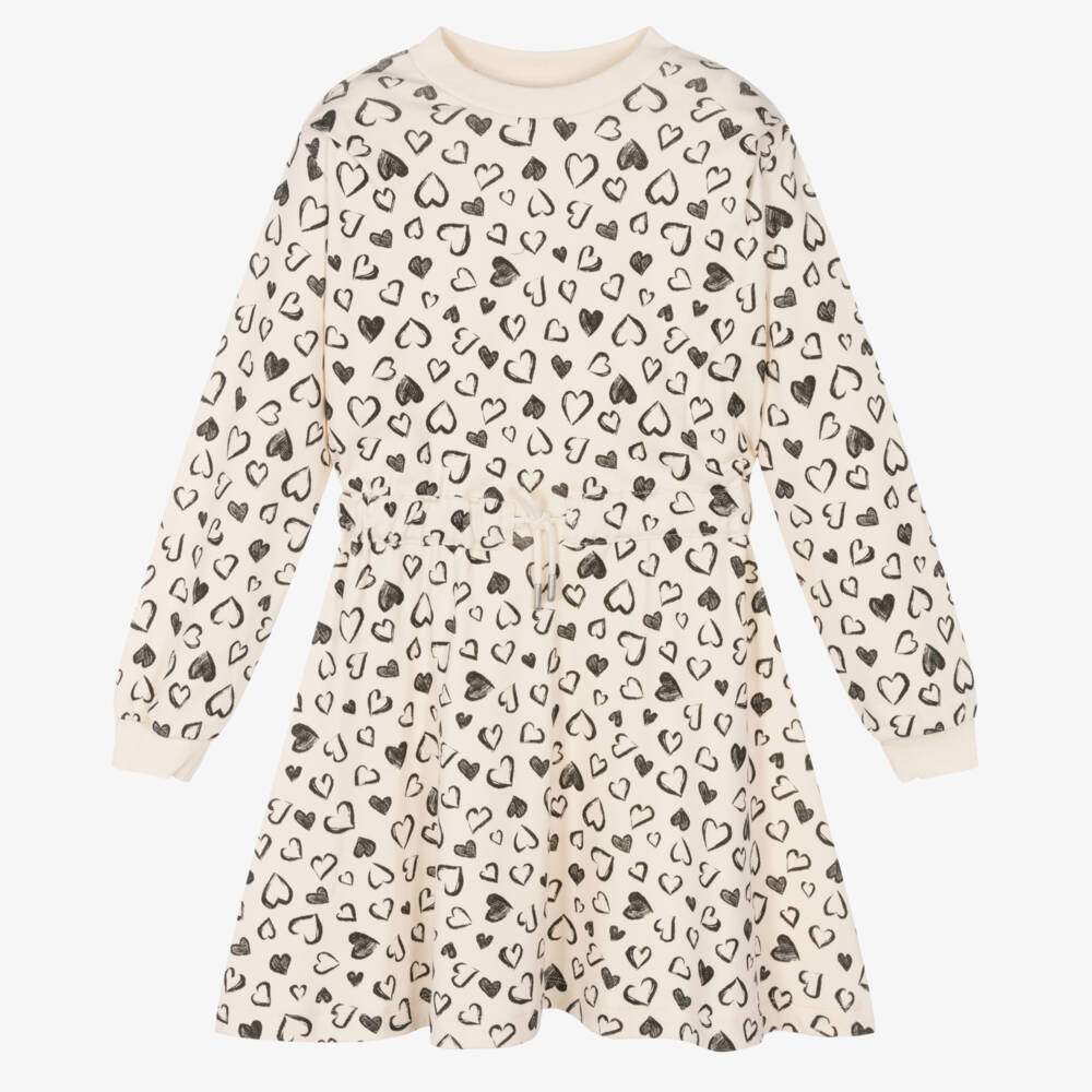 Ivory cotton sweatshirt dress for girls by Mayoral, with a black heart pattern and small shoulder pads to give shape. Ideal for relaxed days, it is made in comfortable, lightweight jersey with an elasticated waist for a good fit and ribbed trims for cosiness.