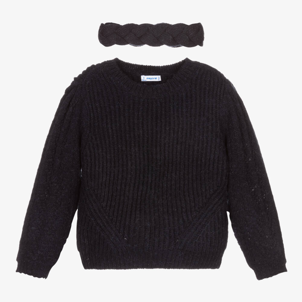 Navy blue sweater for girls by Mayoral, made in a soft, mid-weight knit. It has a ribbed design, with pretty lacy knit detailing on the sleeves. It comes with a matching, plaited effect, knitted headband.