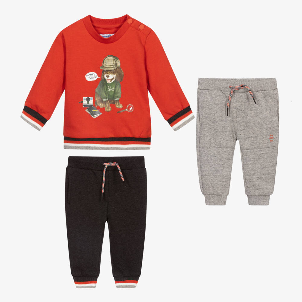 Younger boys three-piece tracksuit by Mayoral, made in soft cotton jersey with a fleecy inside. The dark orange sweatshirt has a fun dog print and popper fasteners on one shoulder. One grey marl and the other dark grey, both joggers have elasticated drawstring waists, extra durable knees to prevent wear, and side seam pockets.