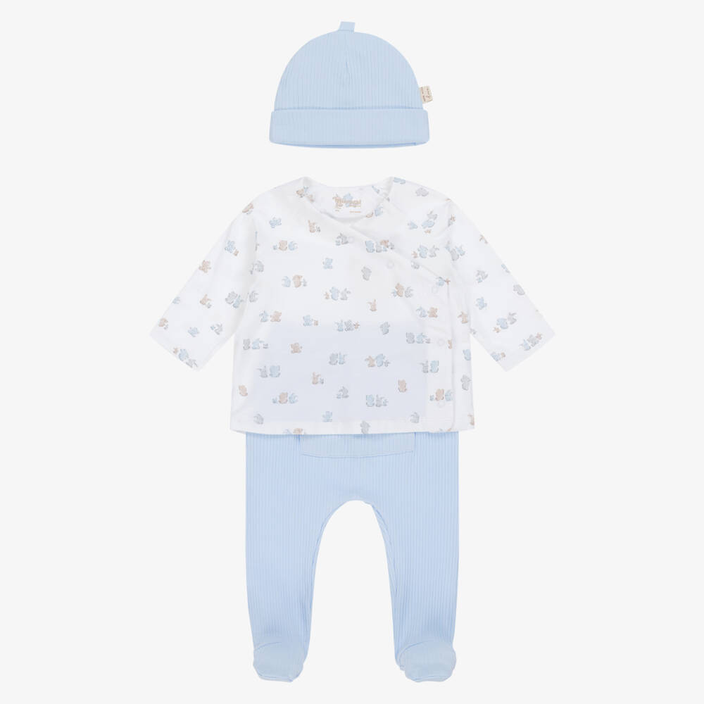 A super cute gift for new arrivals, this pale blue cotton jersey babysuit set for boys is by Mayoral. Beautifully comfortable, it comprises a front-fastening top patterned with beige bunnies and bears, ribbed, pull-on trousers and a coordinating hat.